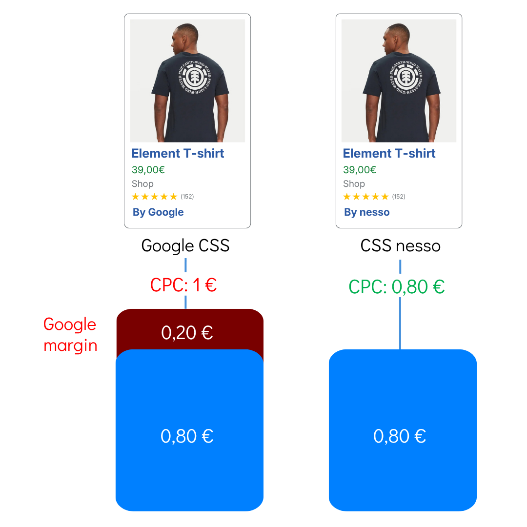 CSS (Comparison Shopping Service) je srovnávač zboží. Evropská komise uložila Googlu pokutu za zneužití dominantního postavení na trhu srovnávačů - Google proto musel otevřít reklamní prostor Google Shopping i třetím stranám. Certifikovaní CSS partneři jako nesso.digital tak mohou inzerovat produkty vašeho e-shopu ve stejném prostoru, ale Google jim k tomu poskytuje systémový kredit - který se promítá do nižšího CPC pro vás.
